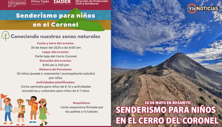 El 10° Ayuntamiento de Playas de Rosarito a cargo de la Presidenta Municipal, Mtra. Rocio Adame Muñoz, continúa fortaleciendo su compromiso con el desarrollo integral de la niñez y la preservación del medio ambiente. Por lo que en esta ocasión, la Delegación Primo Tapia, te invita a participar en el evento “Conociendo nuestras Zonas Naturales, Senderismo para Niñas y Niños en el Coronel”, el próximo viernes 30 de mayo de 2025, de 8:00 a 13:00 horas, en la parte baja del Cerro del Coronel, en la comunidad de San Jerónimo.
