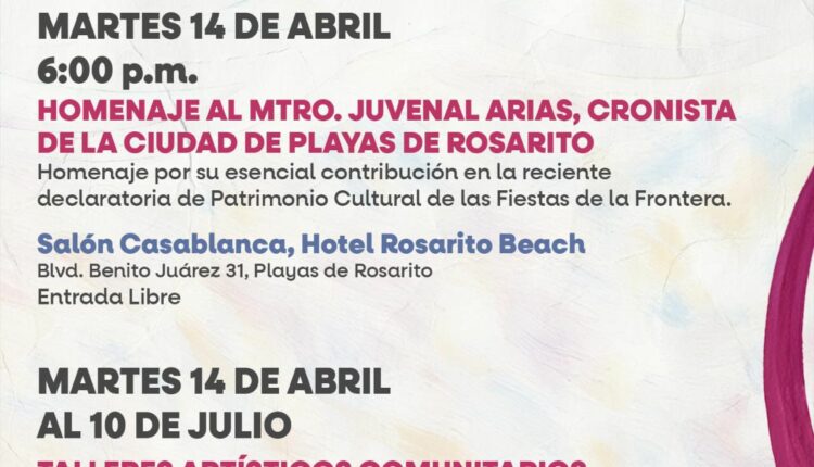 Asimismo, se realizará un homenaje al maestro Juvenal Arias, cronista de la ciudad, en reconocimiento a su valiosa contribución a la preservación de la memoria histórica de Playas de Rosarito, particularmente en la declaratoria de las Fiestas de la Frontera como Patrimonio Cultural.