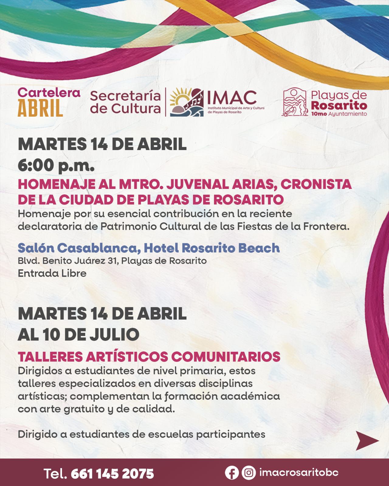 El 10° Ayuntamiento de Playas de Rosarito, encabezado por la presidenta municipal Rocío Adame Muñoz, a través de la Secretaría de Cultura y el Instituto Municipal de Arte y Cultura (IMAC), invita a la ciudadanía a formar parte de la cartelera cultural del mes de abril, una programación diversa que celebra la cultura, el arte, la historia y la convivencia comunitaria.