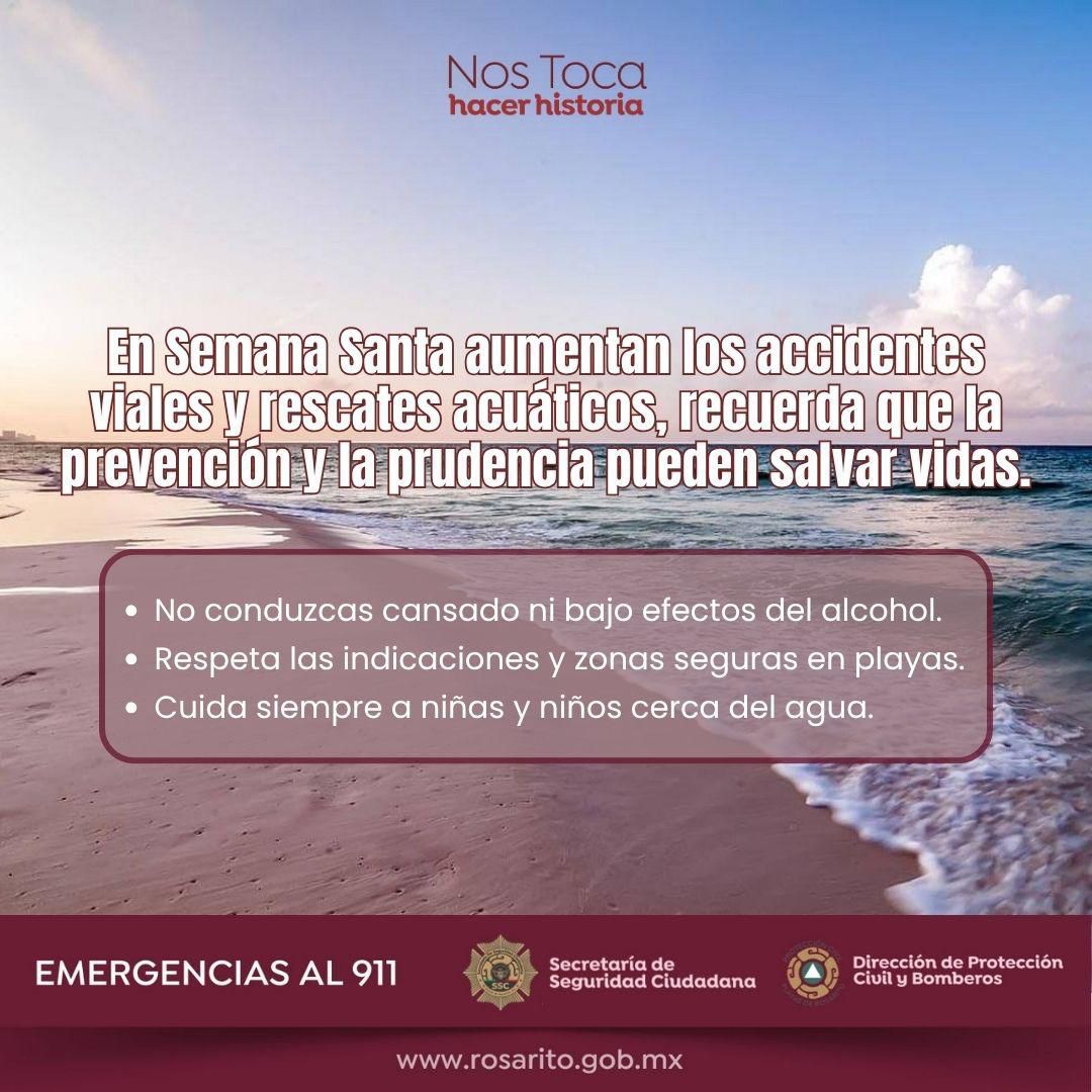 El 10° Ayuntamiento de Playas de Rosarito, encabezado por la presidenta municipal, Rocío Adame Muñoz, a través de la Secretaría de Seguridad Ciudadana, exhorta a la población a reforzar las medidas de prevención durante el periodo de Semana Santa, con el objetivo de salvaguardar la integridad de residentes y visitantes.