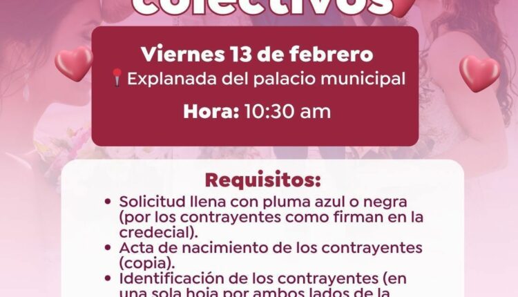 La ceremonia de Matrimonios Colectivos se llevará a cabo el viernes 13 de febrero de 2026, en la Explanada del Palacio Municipal, en punto de las 10:30 de la mañana, en un evento que busca brindar a las parejas la oportunidad de formalizar su unión de manera accesible y significativa.