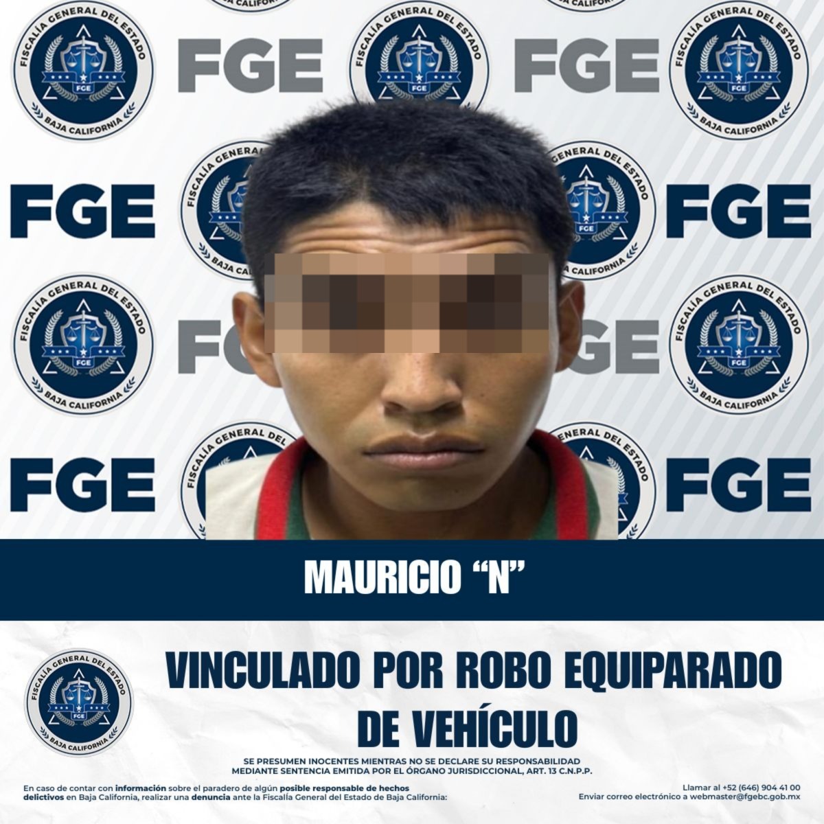 La Fiscalía Regional de Tijuana, a través de la Unidad de Investigación de Robo de Vehículos, logró obtener la vinculación a proceso con prisión preventiva justificada en contra de Mauricio “N”, por su presunta responsabilidad en el delito de robo equiparado de vehículo de motor en su modalidad de poseer.