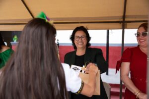 Como parte del gesto simbólico de ser la madrina de generación 2019-2025, la presidenta municipal entregó regalos conmemorativos a sus ahijadas y ahijados, destacando que la educación es uno de los ejes prioritarios de su gobierno.
