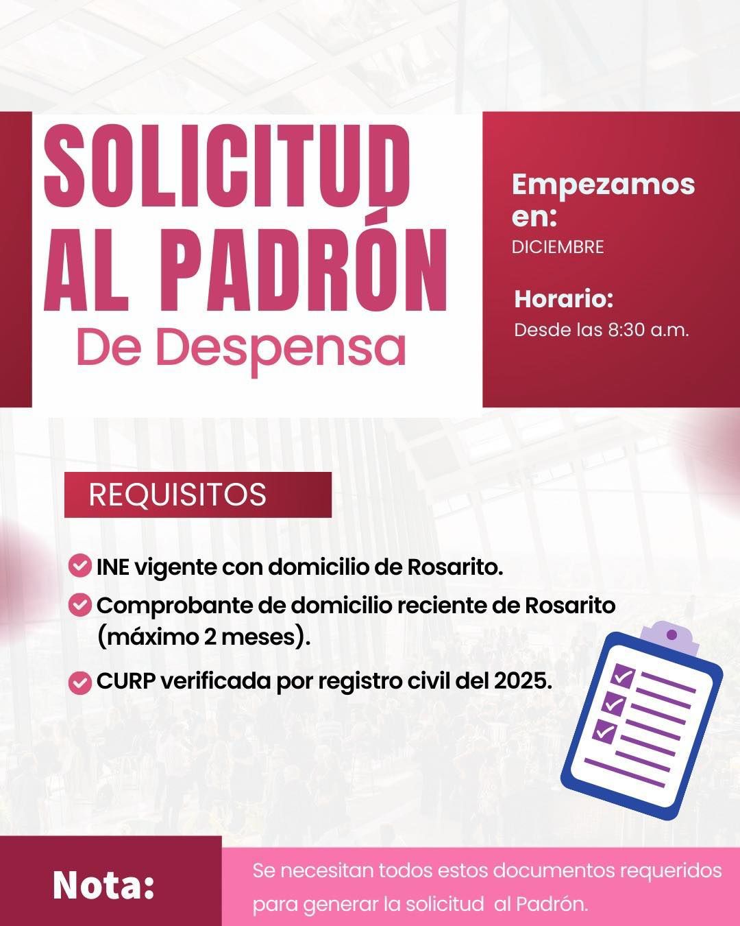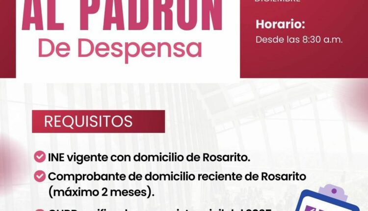 Durante todo el mes de diciembre, el DIF Municipal Playas de Rosarito estará recibiendo solicitudes para integrarse al Padrón de Despensas, con el propósito de continuar brindando apoyo alimentario a las familias que más lo necesitan.