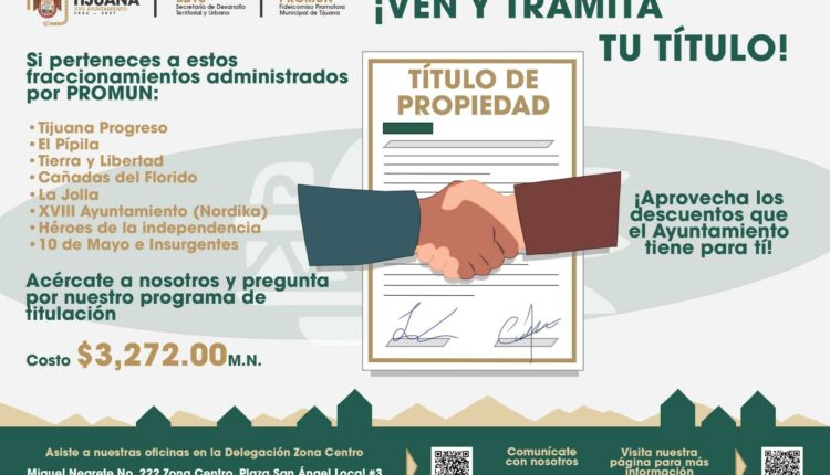 El XXV Ayuntamiento de Tijuana, a través del Fideicomiso Promotora Municipal (PROMUN), cuenta con el Programa de Titulación, una iniciativa que brinda certeza jurídica a las familias de diversos fraccionamientos de la ciudad al entregarles títulos de propiedad de manera accesible y ágil, tal como lo ha instruido el alcalde, Ismael Burgueño Ruiz.