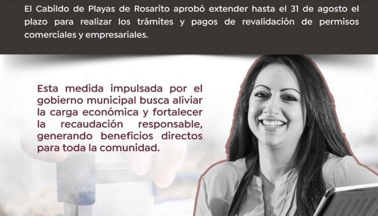 Con el objetivo de seguir fortaleciendo la economía local y generar condiciones favorables para el crecimiento de los negocios en el municipio, el Gobierno Municipal de Playas de Rosarito hace un llamado a comerciantes, empresarios, emprendedores y representantes del sector turístico a aprovechar la prórroga autorizada por el Cabildo para realizar la revalidación de permisos de operación hasta el 31 de agosto de 2025.