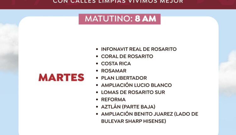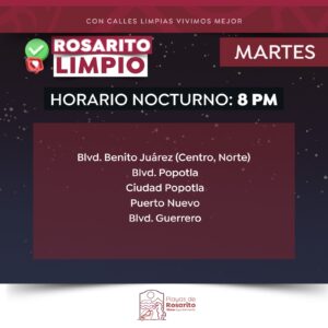 Con el firme objetivo de optimizar la limpieza urbana y mejorar el flujo vehicular en áreas de alta circulación, la presidenta municipal, Mtra. Rocio Adame Muñoz, a través de la Dirección de Servicios Urbanos, informa a la ciudadanía sobre los horarios de recolección de basura para mañana martes 13 de mayo, los cuales se llevarán a cabo en los siguientes horarios y ubicaciones: