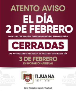 El XXV Ayuntamiento de Tijuana, informa a la ciudadanía que el próximo lunes 2 de febrero será día de asueto para todo el personal, motivo por el cual, las oficinas en Palacio Municipal, delegaciones y dependencias paramunicipales permanecerán cerradas a la atención ciudadana.